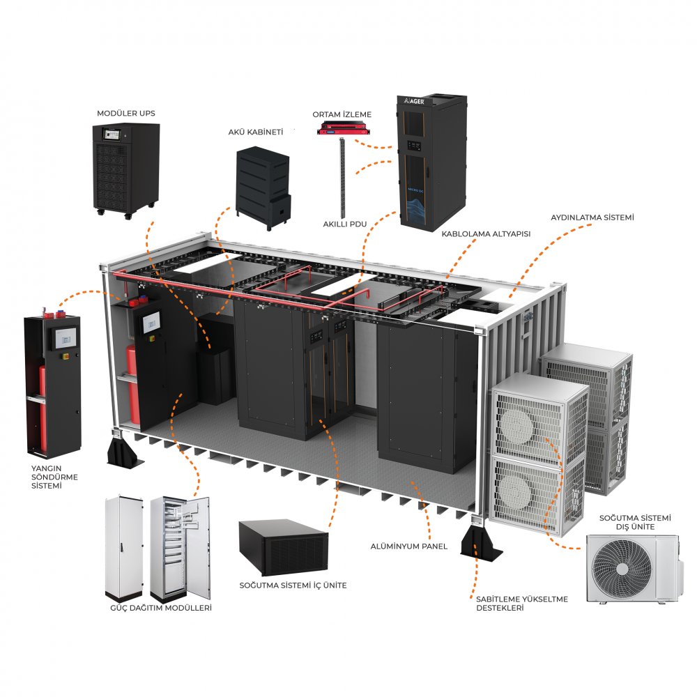 AGER Konteyner Veri Merkezleri , kompakt yapısı, hızlı devreye alma ve taşınabilme avantajı ile güvenilir bilgi-işlem altyapısı sunmak üzere tasarlanmıştır. Fabrikada tüm entegrasyonu tamamlanarak, testleri yapılmış, son kullanım lokasyonuna hazır anahtar teslim bir veri merkezi çözümüdür.Bilgi işlem altyapılarının tek bir yapı içinde konumlandırılmasıyla, yüksek güvenlik, sağlamlık ve sürdürülebilirlik beklentileri; kolay taşınabilirlik ve konumlandırılabilirlik özellikleriyle entegre edilmiştir.